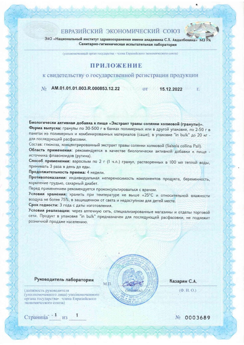 Состав: Концентрированный экстракт травы солянки холмовой (Salsola collina Pall), вспомогательное вещество: глюкоза.